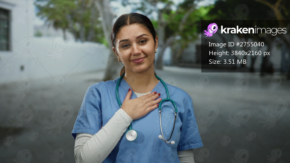 Young woman in scrubs with stethoscope outdoors shows gratitude, blending medical professionalism in an urban setting.