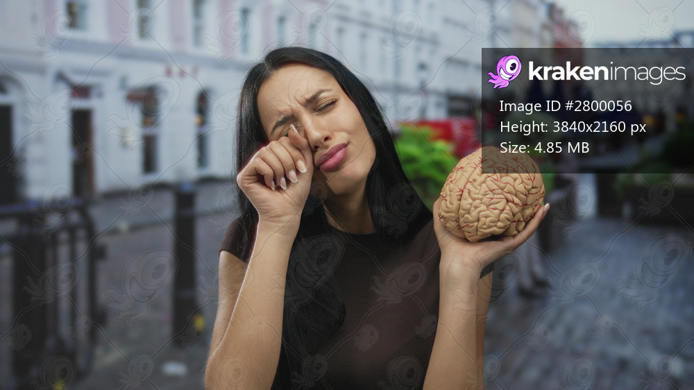 Young woman in street holding brain model with sad expression outdoors in city environment suggesting stress or confusion.
