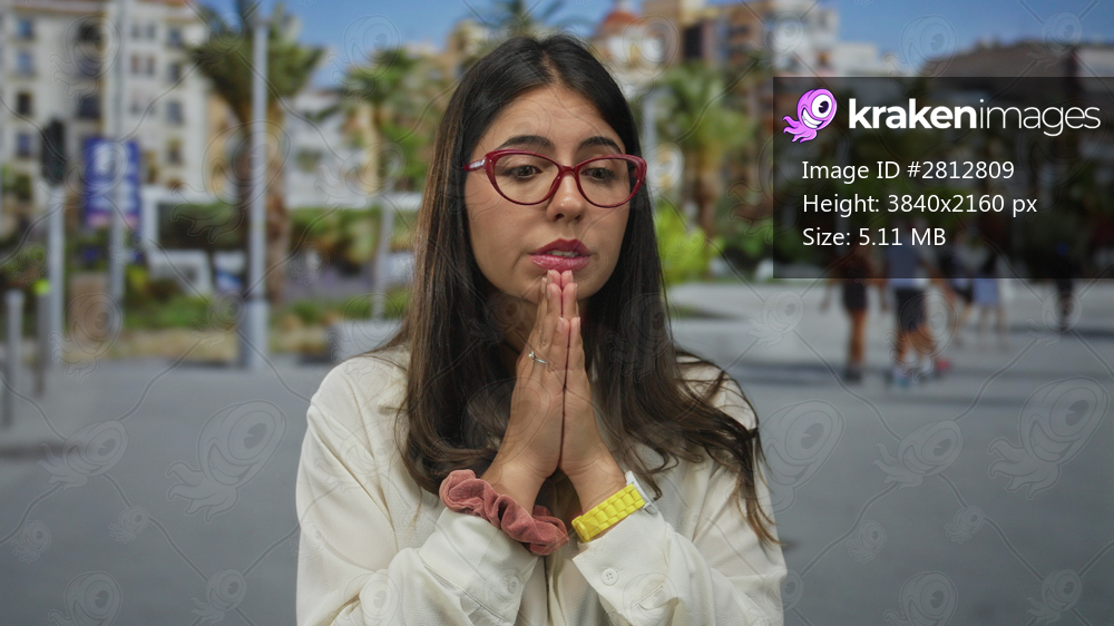Young woman in street praying with hopeful expression outdoors surrounded by urban environment with people in background looking upward wearing glasses - Kraken Images