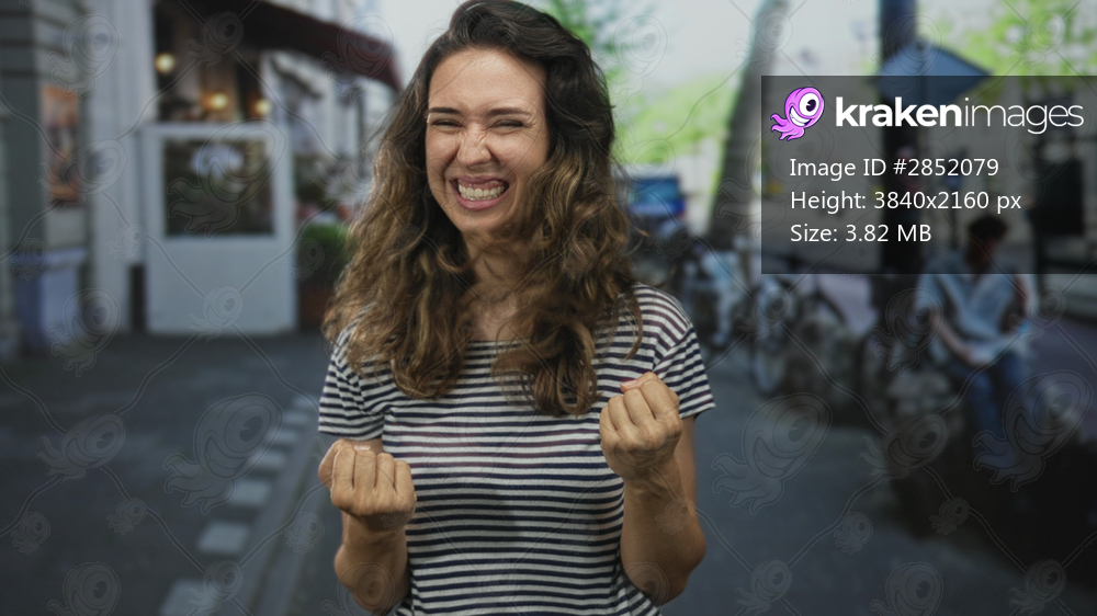 Young woman in striped shirt clenches both fists near her chest on a bustling city street lined with bikes and buildings; excitement.