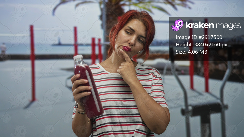 Young woman in striped shirt holding bottle of juice, finger on chin pensive pose on street; uncertainty curiosity.