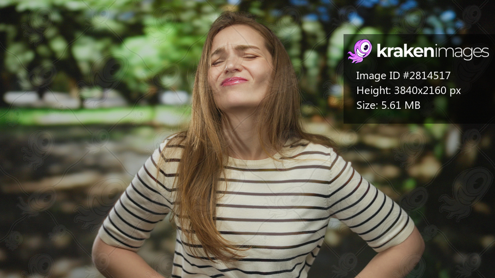 Young woman in striped shirt stands with hands on hips frowning at midday sunlight through green leaves in forest; annoyance.