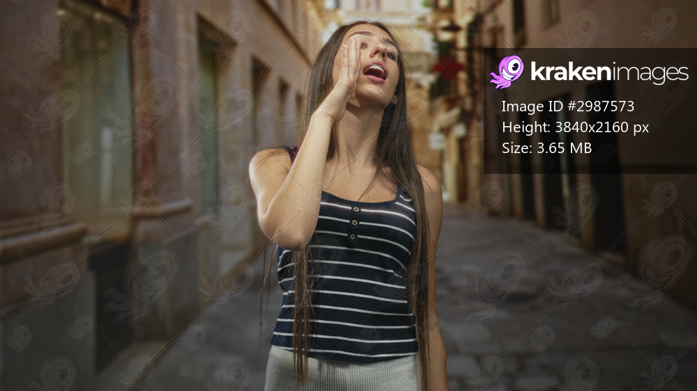 Young woman in striped tank top with long hair raising hand and rolling eyes in narrow cobblestone street; annoyance.
