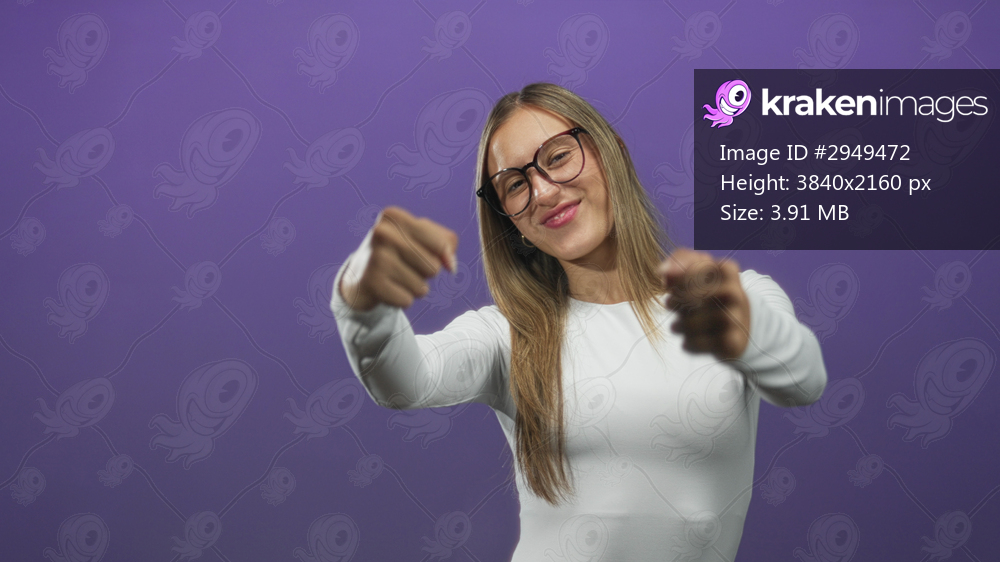 Young woman in studio wearing glasses and white shirt, smiling with both fists extended toward camera; confidence.
