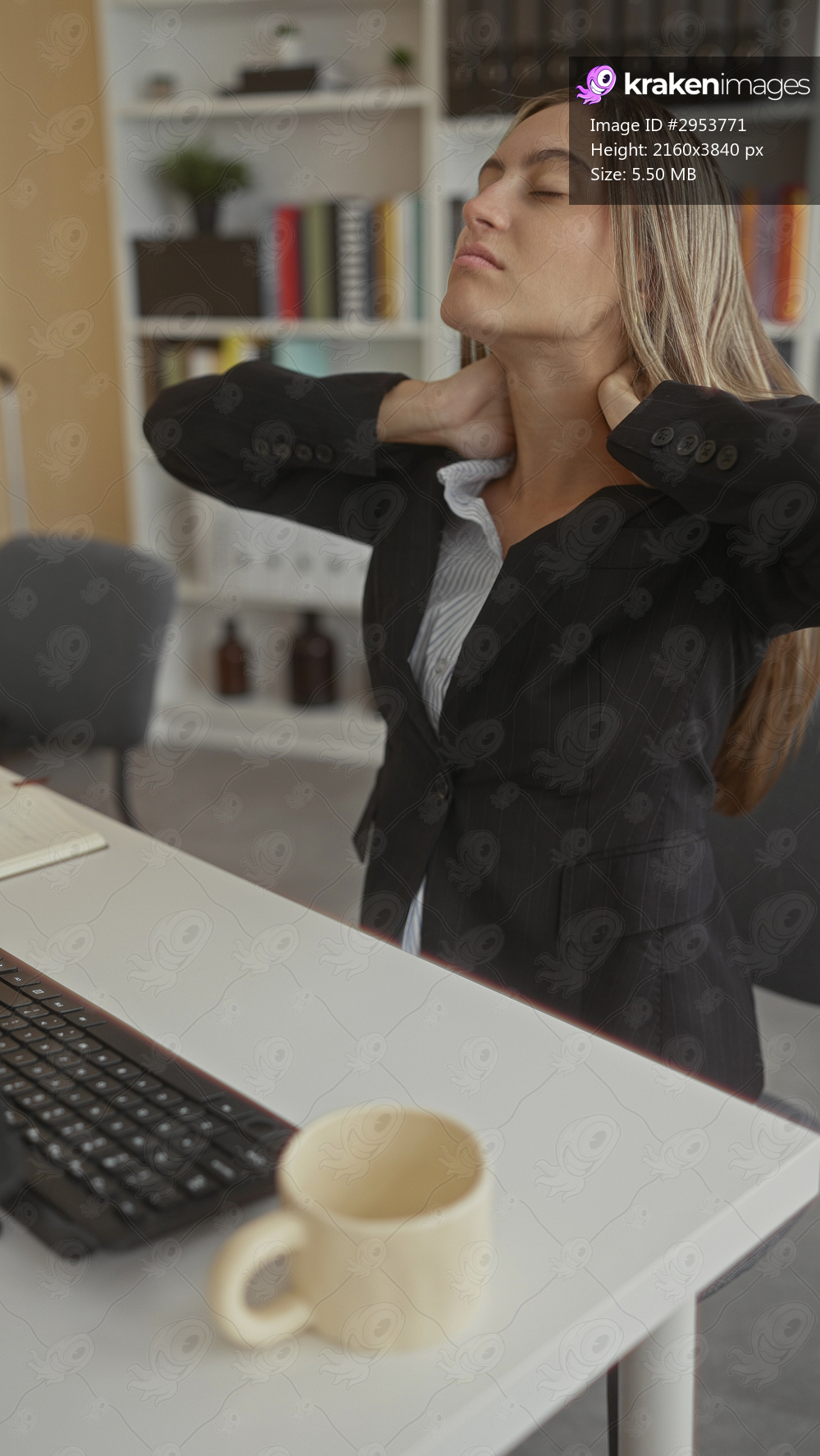 Young woman in suit jacket holds neck and tilts head at desk beside keyboard and coffee mug with bookshelves behind in office building; fatigue.