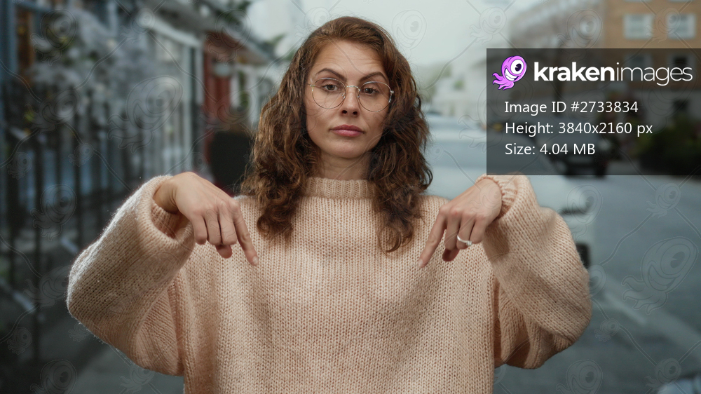 Young woman in sweater gesturing on urban street showcasing casual style with curly hair glasses and relaxed expression outdoors in vibrant city setting - Kraken Images
