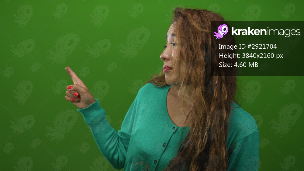 Young woman in teal sweater points finger with exposed hand and shrugs in studio green screen; indifference.