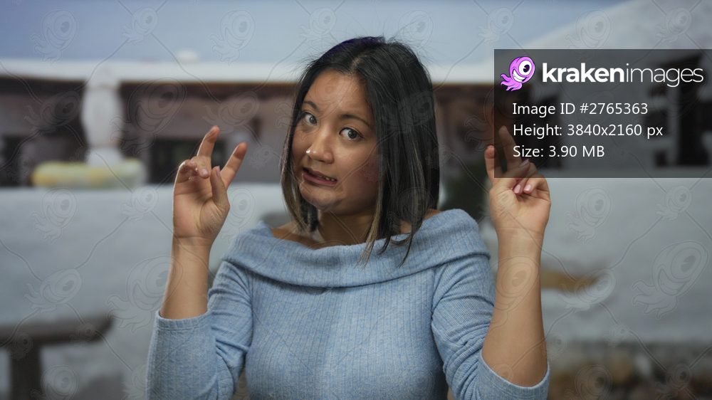 Young woman in urban street making gesture outdoors suggesting humor and surprise in city environment