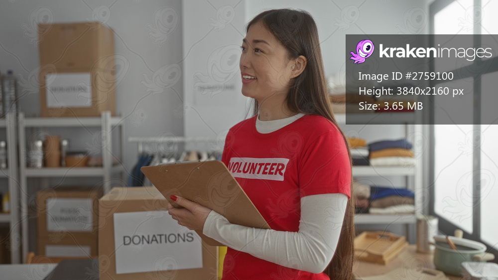 Young woman in volunteer shirt holding clipboard in donation center room with boxes and clothing, representing charity work indoors.