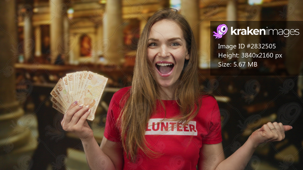 Young woman in volunteer shirt holds fanned turkish lira banknotes in building; charity support generosity.