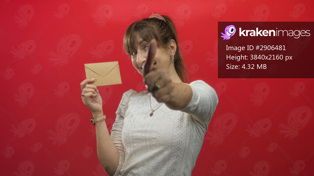 Young woman in white blouse holding small brown envelope and giving thumbs up in red studio; celebration surprise success.