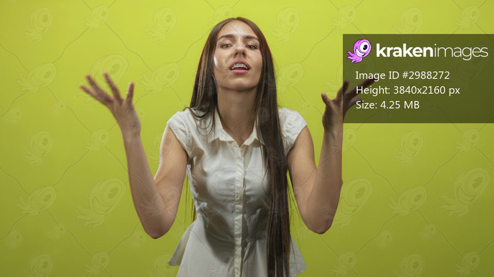 Young woman in white blouse raises hands and shrugs with pleading expression in studio; frustration pleading.