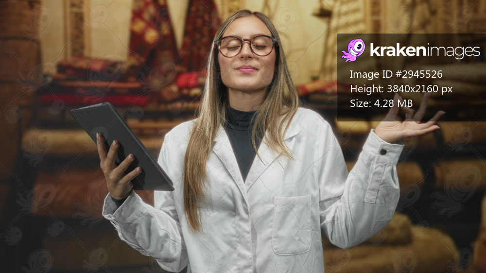 Young woman in white coat wearing glasses holding tablet with eyes closed and hand in meditation mudra in studio among fabric rolls; mindfulness calm.