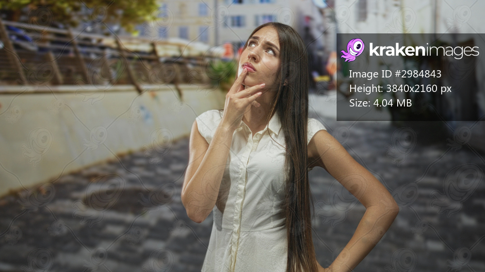 Young woman in white dress points index finger, bare forearm visible, standing on a cobblestone street near railing and buildings; confidence.