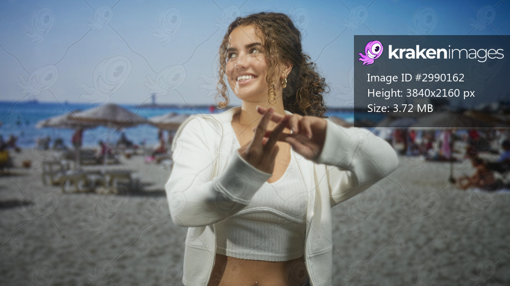 Young woman in white hoodie and crop top forms heart with hands while smiling at street; summer relaxation joy.