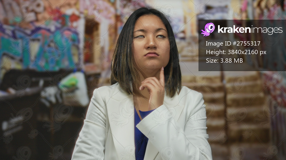Young woman in white jacket standing on colorful graffiti street in a city, expressing confidence and attitude outdoors.