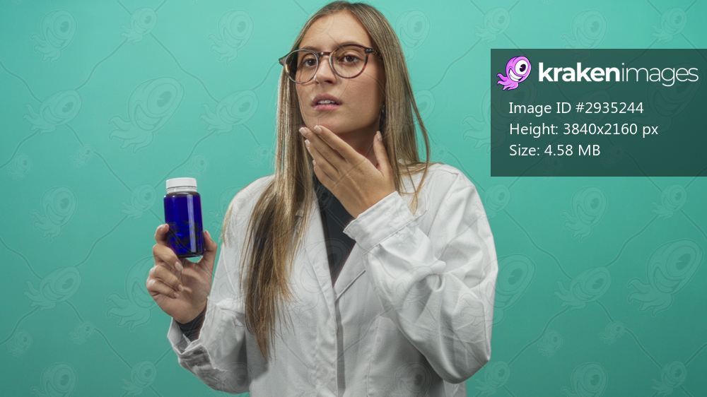 Young woman in white lab coat holding cobalt blue bottle with fingers to chin in studio; thoughtful product testing.