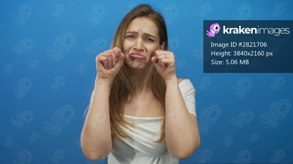 Young woman in white off shoulder top pouting lips and clenching fists to face in blue studio set; sadness.