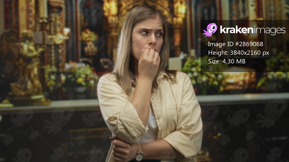 Young woman in white shirt biting nails with left arm crossed over chest beside ornate altar in church building; anxiety doubt stress worry.