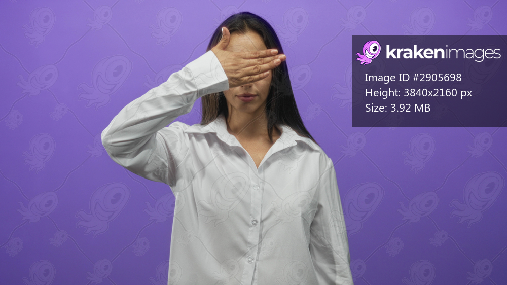 Young woman in white shirt covering eyes with hand in purple studio smiling subtly while posing; playful curiosity.