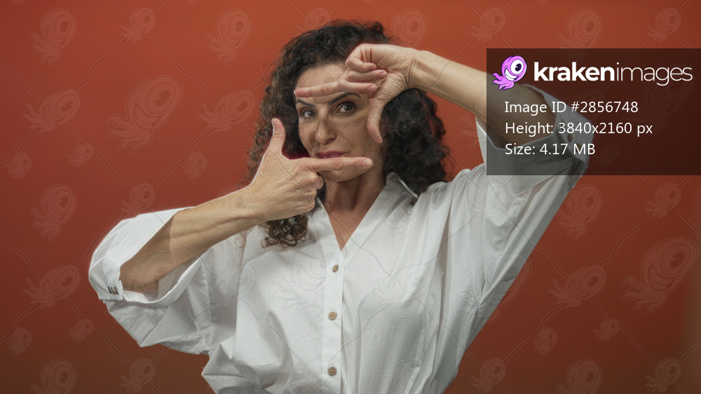 Young woman in white shirt frames face with finger framing gesture in orange studio; creativity vision.