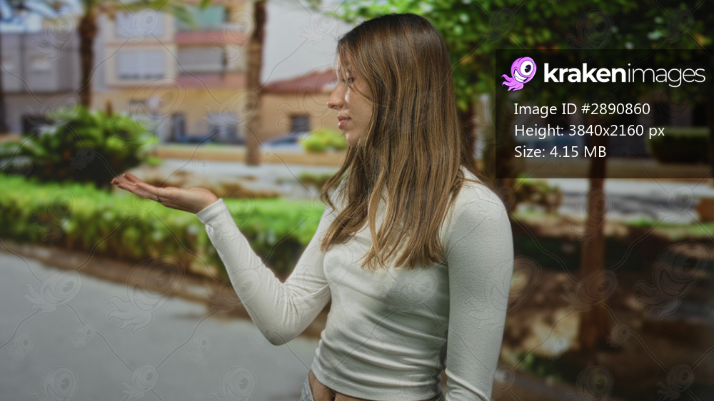 Young woman in white shirt holds palm up in park with green trees and bushes, side profile looking at hand while presenting gesture; uncertainty curiosity. - Kraken Images