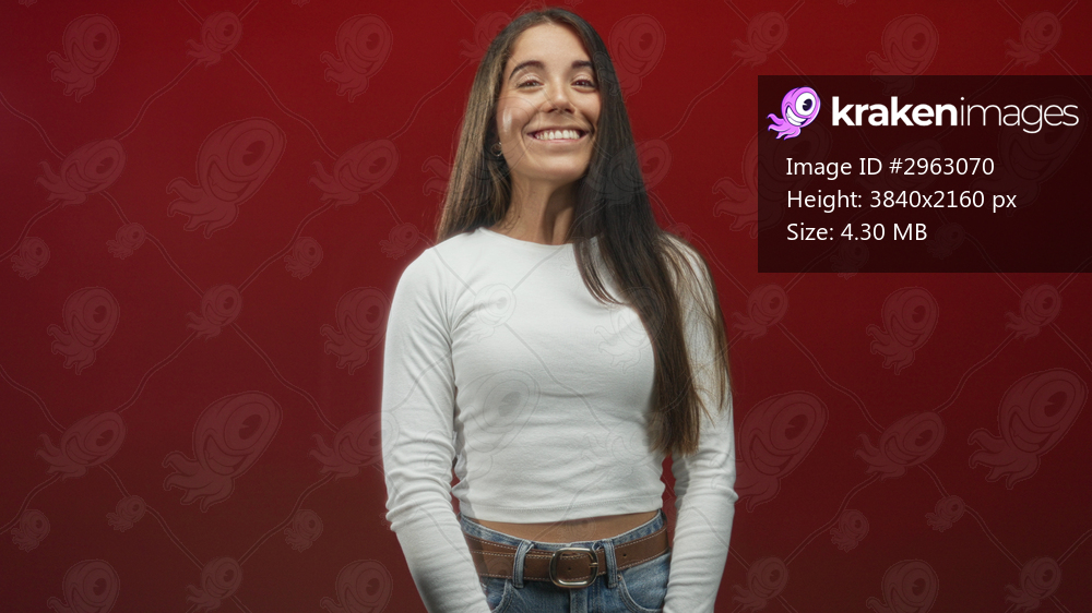 Young woman in white shirt shows anxious face, slight head tilt and tense posture while looking upward in studio red backdrop; uncertainty.