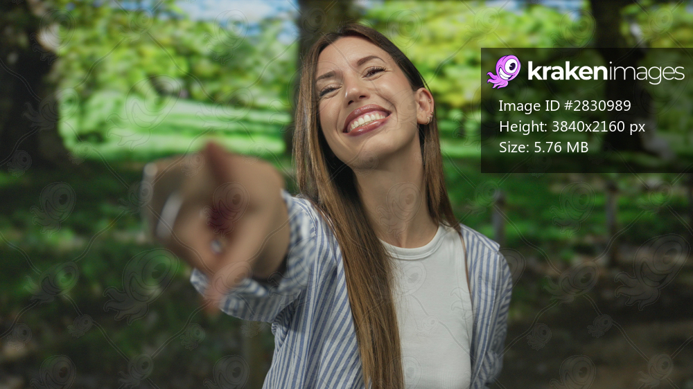 Young woman in white shirt smiles while making heart gesture with her hands in green forest; affection love.
