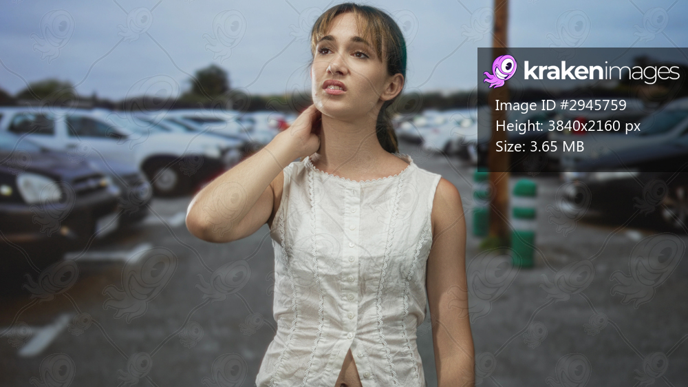 Young woman in white sleeveless top touching neck and exposed midriff in street among parked cars; frustration waiting.