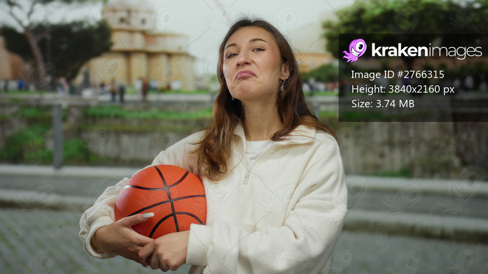 Young woman in white sweatshirt holding basketball with happy expression outdoors on a city street, surrounded by urban landscape and trees, enjoying a leisurely day. - Kraken Images