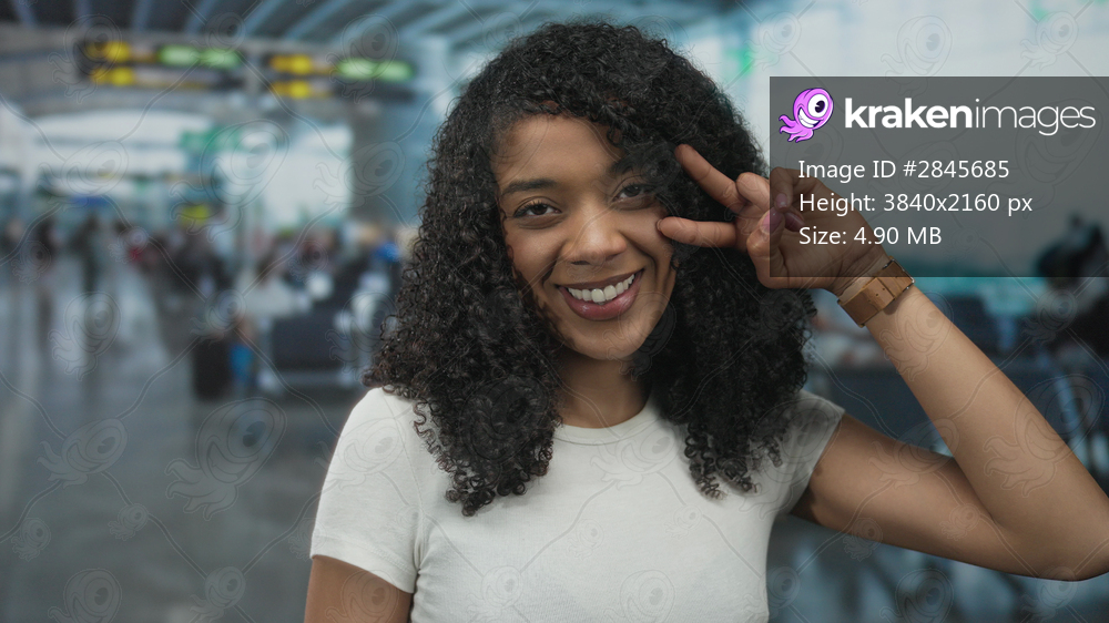 Young woman in white t shirt flashes peace sign with hand at busy indoor airport terminal; peace joy.