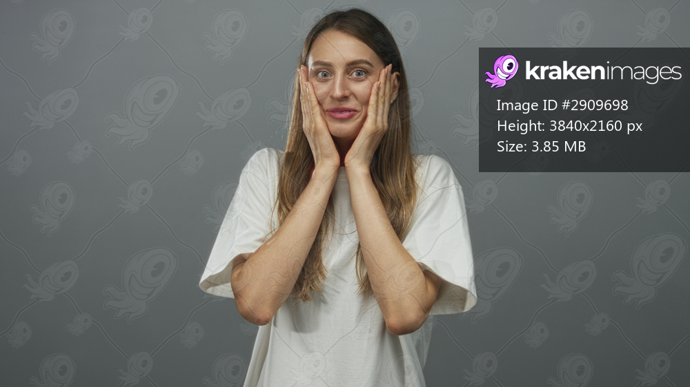 Young woman in white t shirt pressing hands to her cheeks with open mouth in gray studio looking at camera with long hair; surprise.