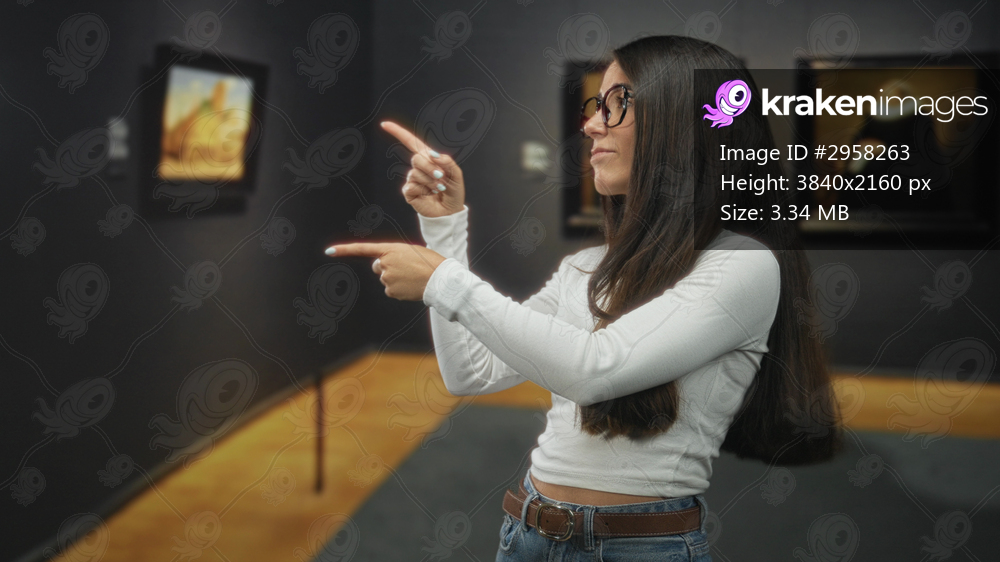 Young woman in white top pointing fingers at framed painting inside a museum building gallery, wearing glasses and jeans; playful curiosity.