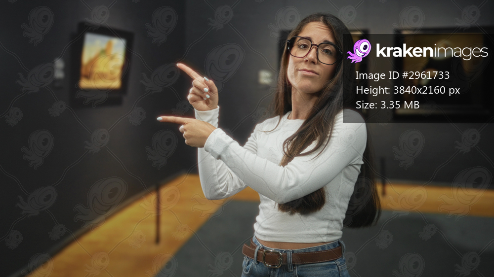 Young woman in white top pointing fingers at framed painting inside a museum building gallery, wearing glasses and jeans; playful curiosity.