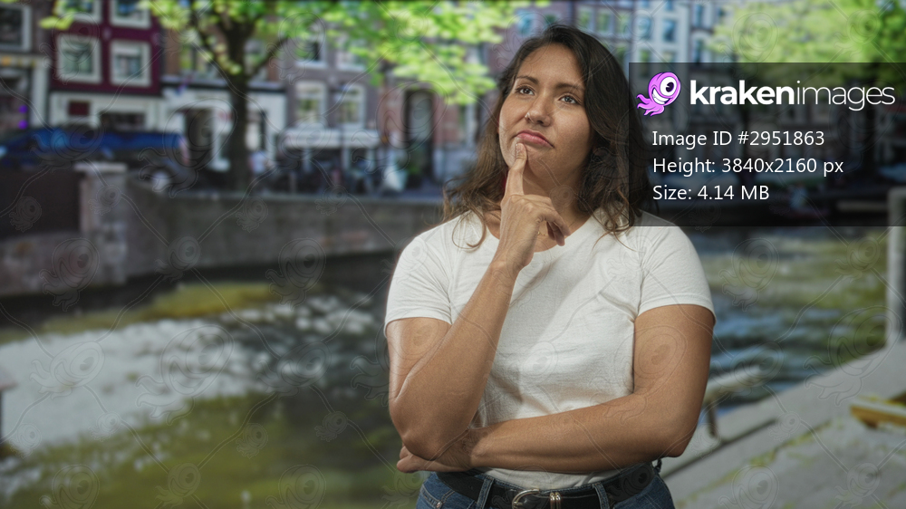 Young woman in white tshirt with hand on chin and arms crossed on street by amsterdam canal, pensive pose; contemplative.