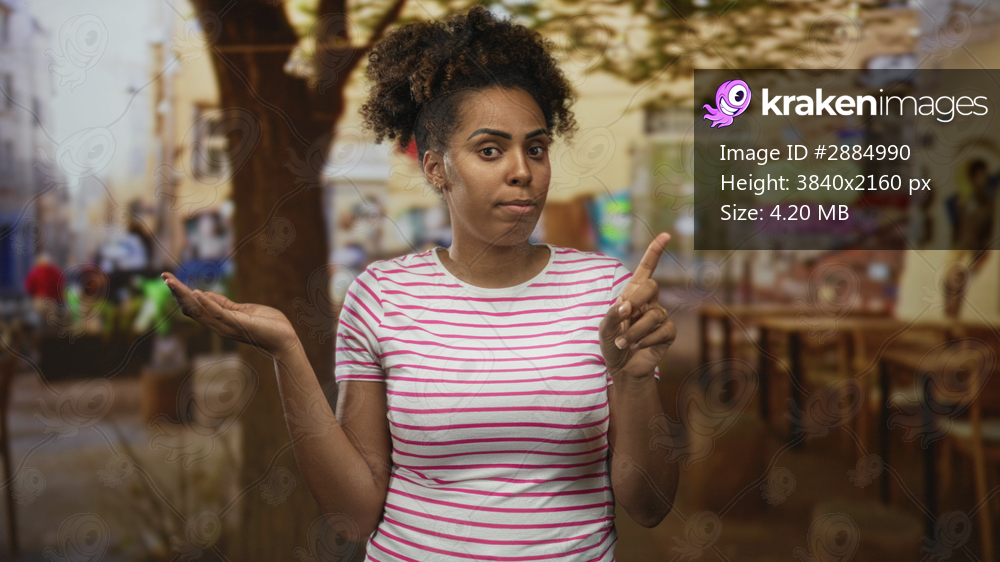 Young woman with index finger raised and open palm at street terrace restaurant outdoor seating area; caution doubt.