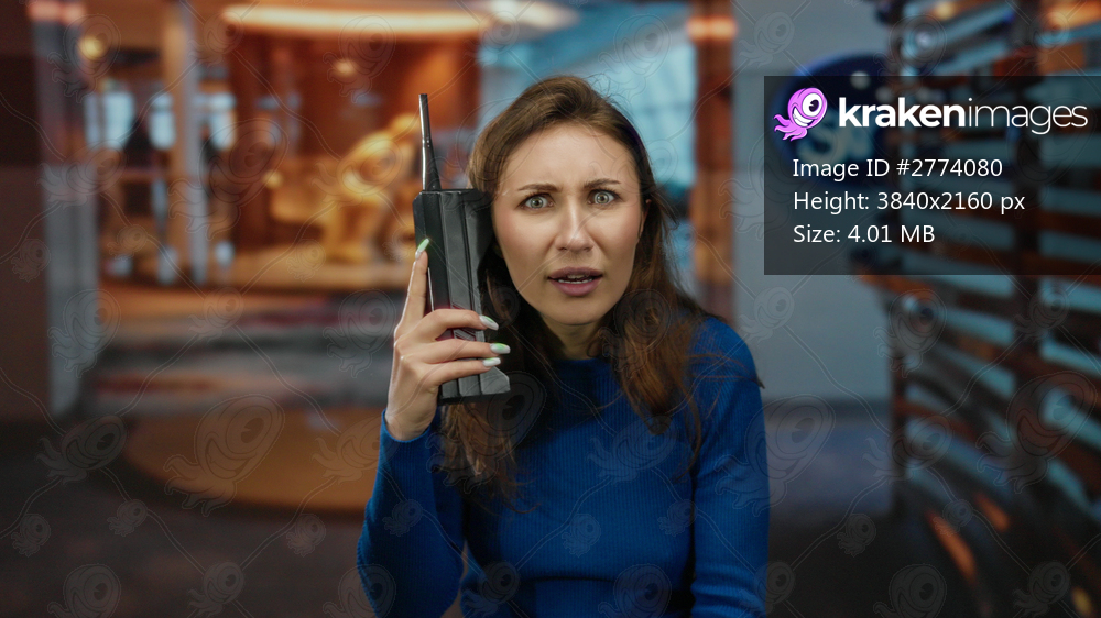 Young woman indoors holding retro phone looking surprised in a hotel lobby setting wearing a blue sweater with expression showing confusion and curiosity. - Kraken Images