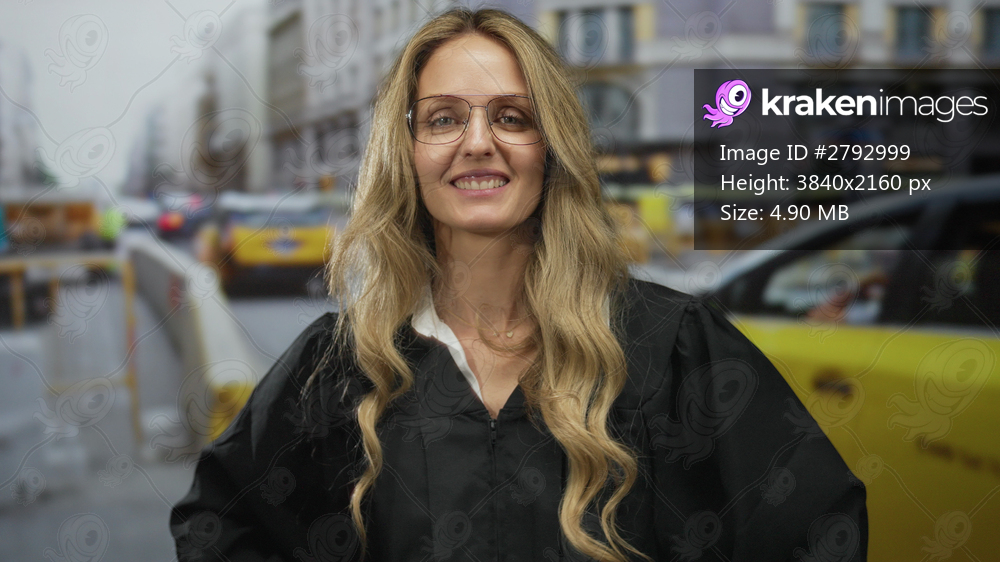 Young woman judge in uniform smiling confidently outdoors at a busy construction site with blurred buildings and vehicles in the background.