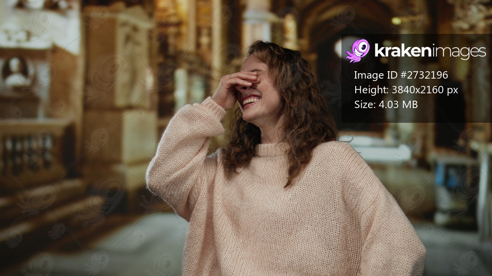 Young woman laughing in a church interior setting, showcasing joy and emotion in a serene religious environment with architectural details enhancing the spiritual ambiance. - Kraken Images