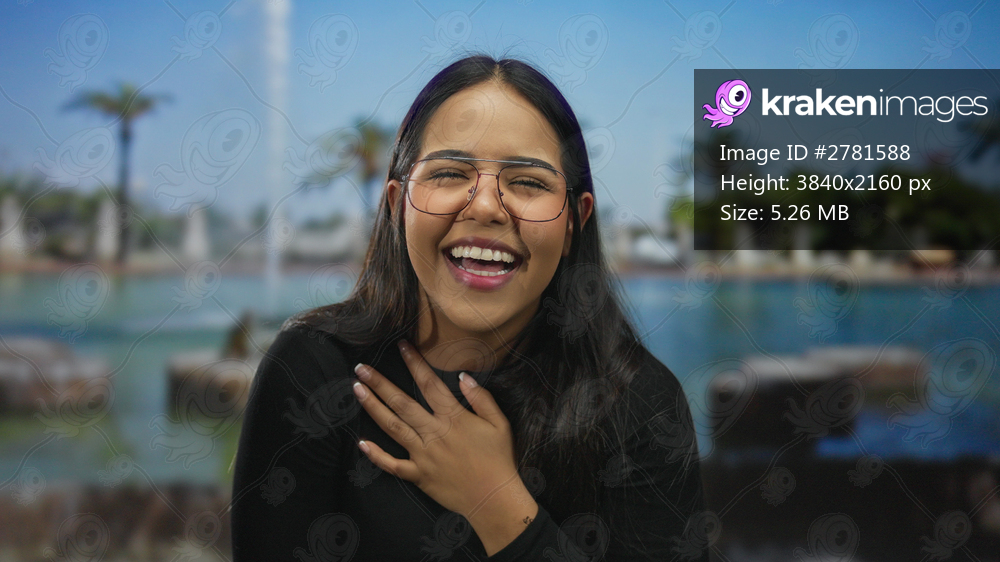 Young woman laughing in a sunny park with a fountain and palm trees in the background