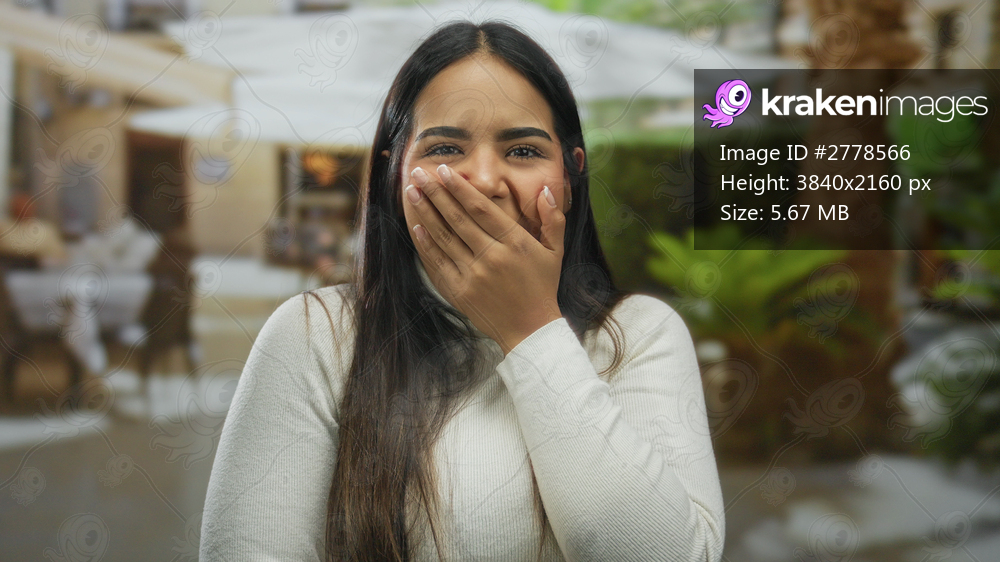 Young woman laughing on a sunny street with trees and tables in the background, creating a lively, vibrant scene full of positive energy and warmth.