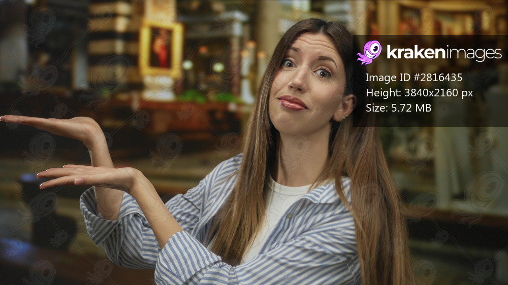Young woman with long brown hair in striped shirt and open palms in church interior; quiet reflection.