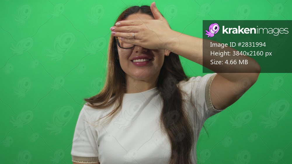 Young woman with long brown hair wearing white t shirt covers eyes with hand in green studio; playful joy.