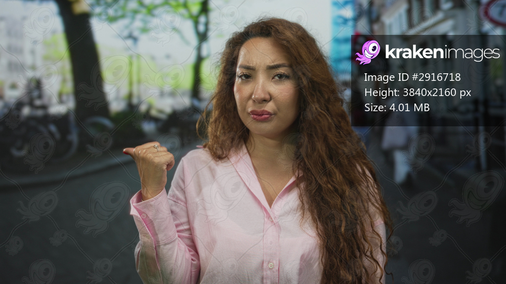 Young woman with long curly hair wearing pink shirt pointing thumb to the side with raised hand on a busy city street; dismissal.