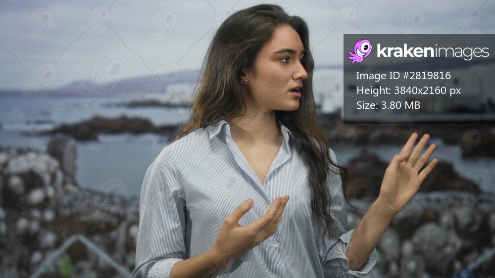 Young woman with long dark hair and shrugged hands and furrowed brows by a seaside building; confusion.