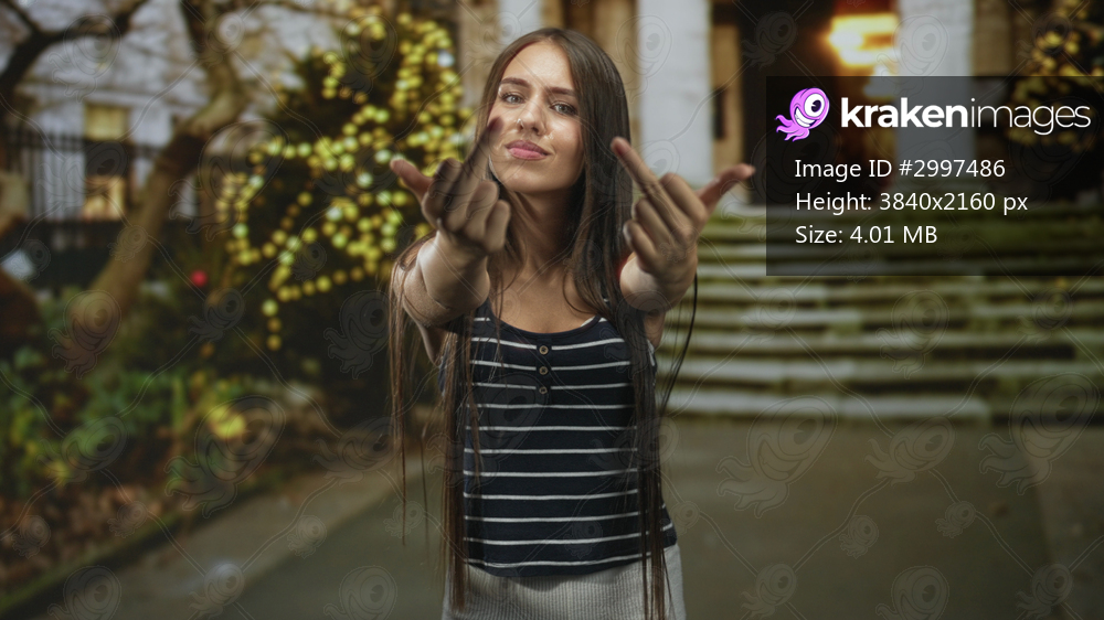 Young woman with long hair and braces reaches forward with both hands and outstretched palms on stone steps of building near lit trees at night; defiance rebellion. - Kraken Images