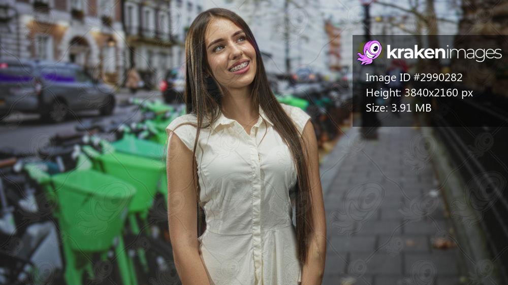 Young woman with long hair and braces smiles and looks up while standing by a row of green rental bikes on a city street; urban optimism travel.