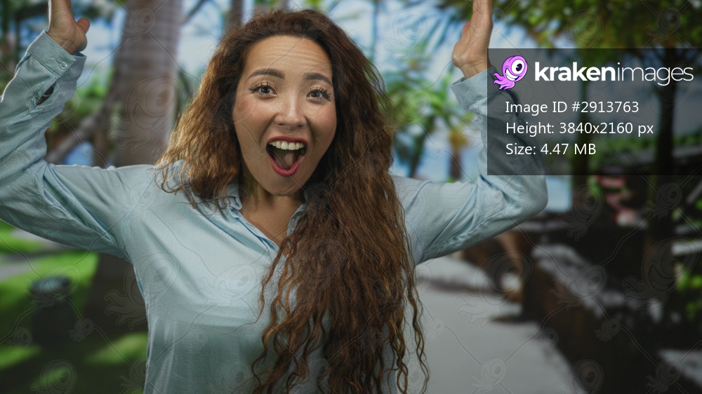 Young woman with long hair covers her eyes with both hands showing red nails and ring, smiling with raised arms on street; playful surprise.