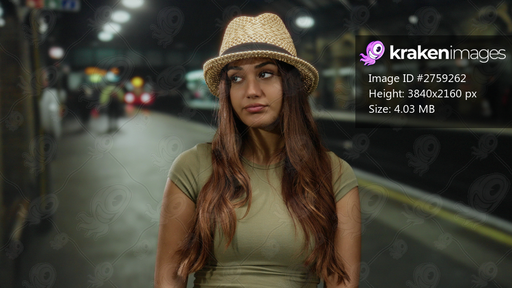 Young woman with long hair and hat stands thoughtfully at indoor train station railway platform, surrounded by blurred commuters and soft lights.