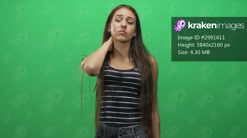 Young woman with long hair holds neck with hand, eyes closed and winces while standing in a green screen studio; discomfort recovery.